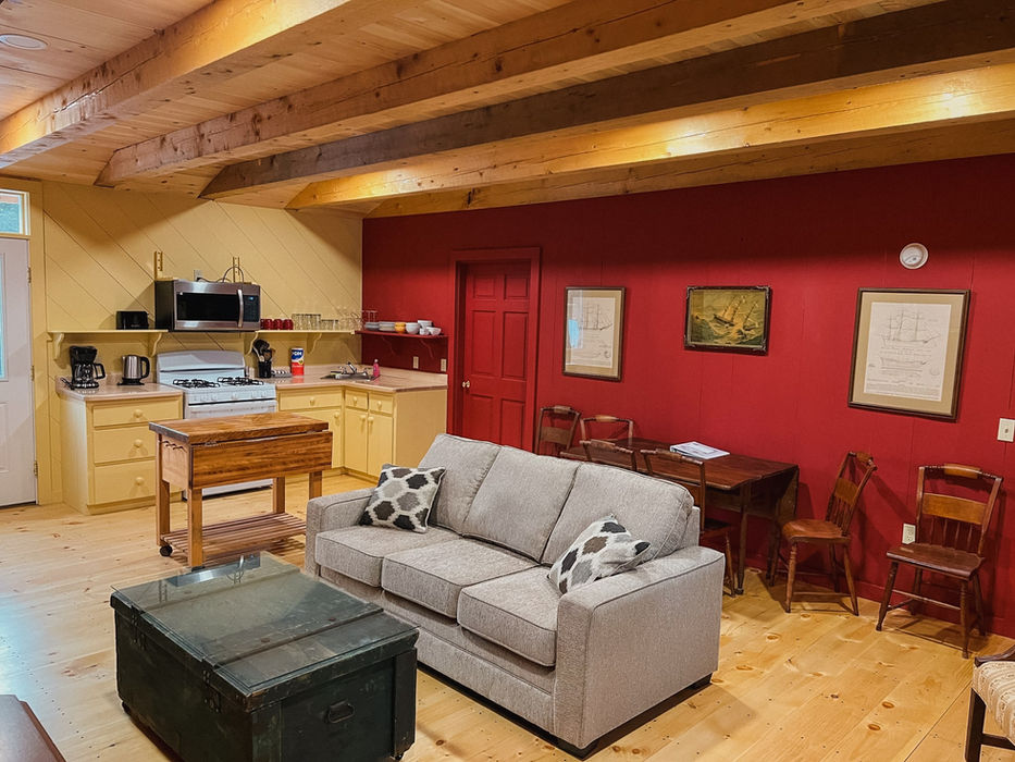 Completed in 2023, The Captain’s Table features two Queen bedrooms with ocean views, a King bedroom with an en suite bathroom, a second full bathroom, and a well-equipped kitchen. With a 42’ x 8’ roofed porch, guests can enjoy sunrise to sunset views of the Lubec Channel and surrounding lighthouses. Furnished with a mix of antiques and modern bedding, this retreat offers year-round warmth and charm for families or groups.